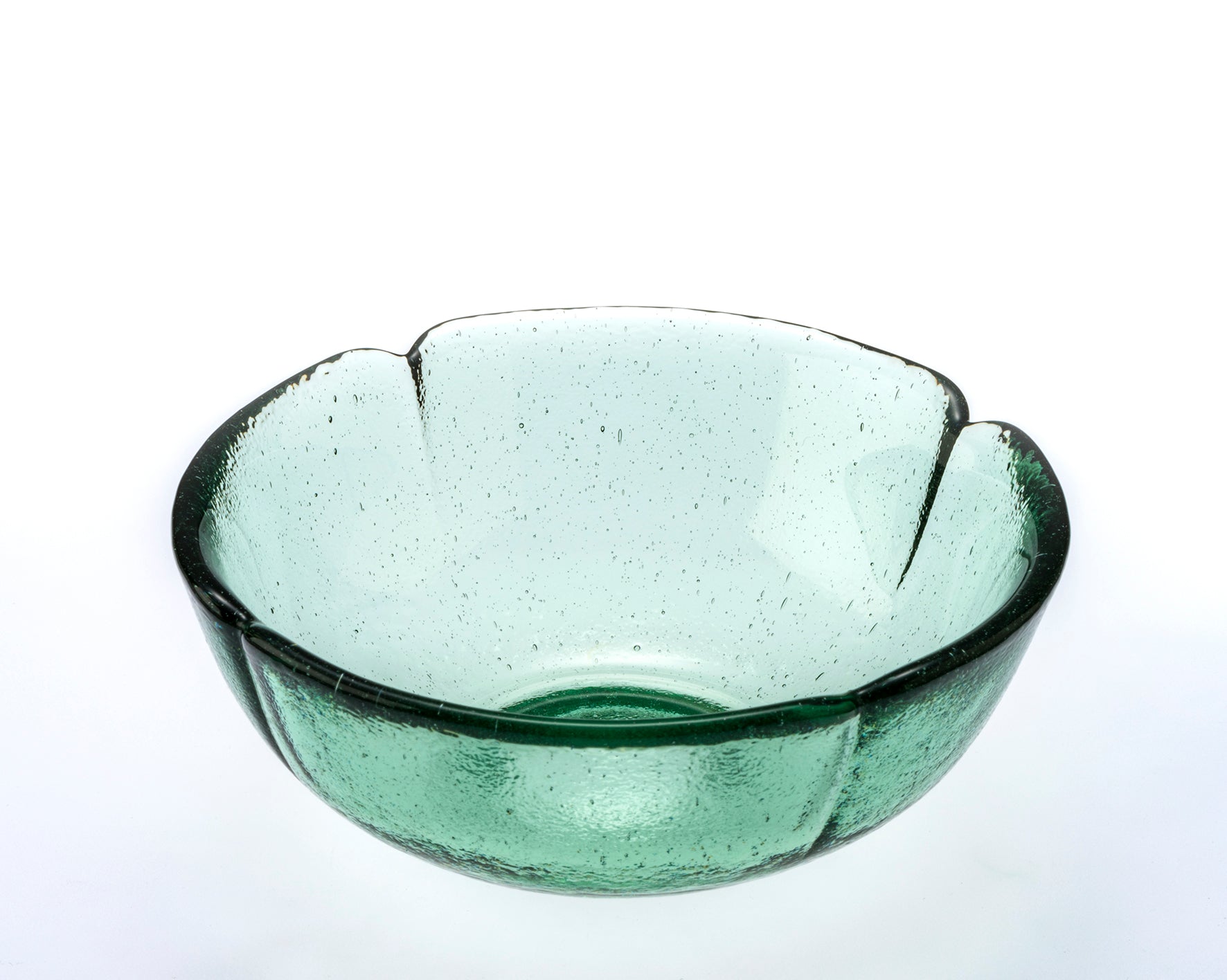 自動車ガラスを再生した、リサイクル花形小皿です。