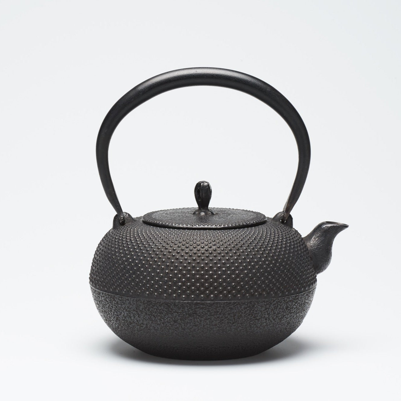 また、表面の独特な模様も南部鉄瓶の特徴の一つ。アラレ模様や動植物の模様など様々ありますが、見た目の美しさだけではなく、鉄瓶の表面積を増やす目的もあります。こちらの霰模様の鉄瓶はその形状や大きさ、配置において微細な違いがあり、各鉄瓶に独自の美しさがあります。長く使い込むことで、さらに味わいが深まるため、一生ものの道具として大切にされることが多いです。また霰模様は日本の伝統的な模様のひとつ。シンプルながらも洗練された美しさをお楽しみください。