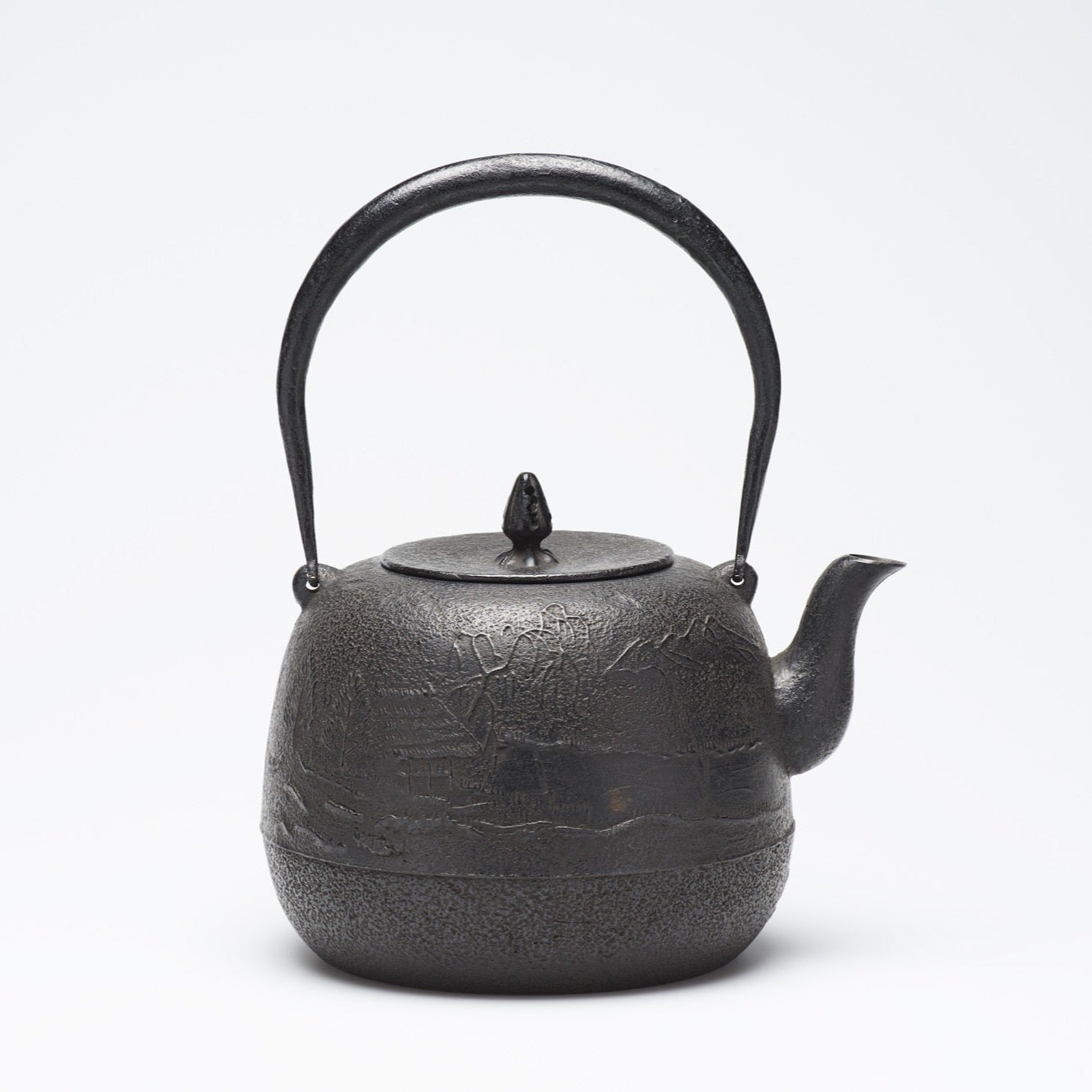 また、表面の独特な模様も南部鉄瓶の特徴の一つ。アラレ模様や動植物の模様など様々ありますが、見た目の美しさだけではなく、鉄瓶の表面積を増やす目的もあります。こちらの山水模様は日本の風景画や山、川、木々、雲などが繊細に表現されています。鉄瓶の質感と相まって、深みや重厚感が増しています。模様の凸凹や陰影が鉄の光沢感をより一層高め、視覚的にも美しい鉄瓶となっています。