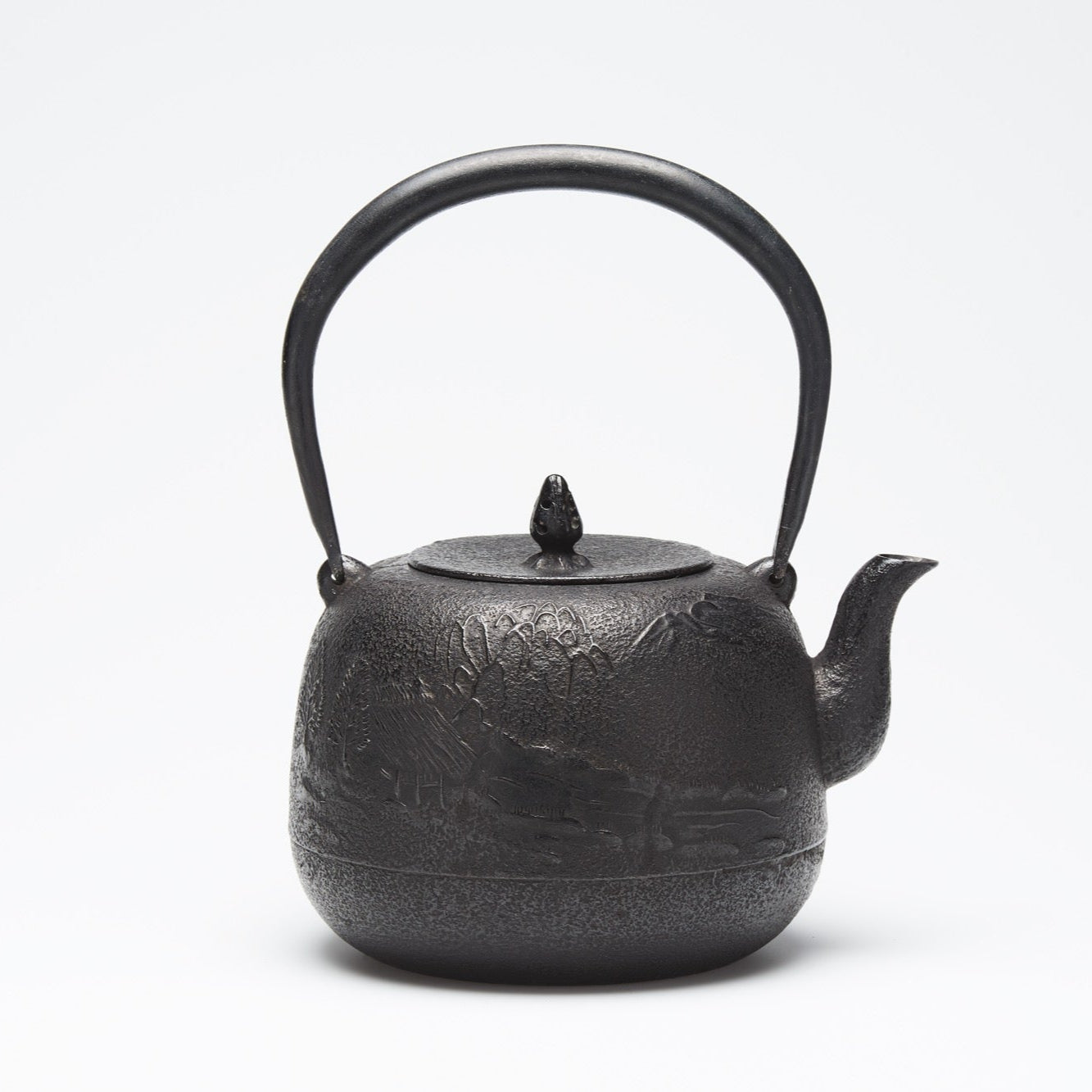 また、表面の独特な模様も南部鉄瓶の特徴の一つ。アラレ模様や動植物の模様など様々ありますが、見た目の美しさだけではなく、鉄瓶の表面積を増やす目的もあります。こちらの山水模様は日本の風景画や山、川、木々、雲などが繊細に表現されています。鉄瓶の質感と相まって、深みや重厚感が増しています。模様の凸凹や陰影が鉄の光沢感をより一層高め、視覚的にも美しい鉄瓶となっています。