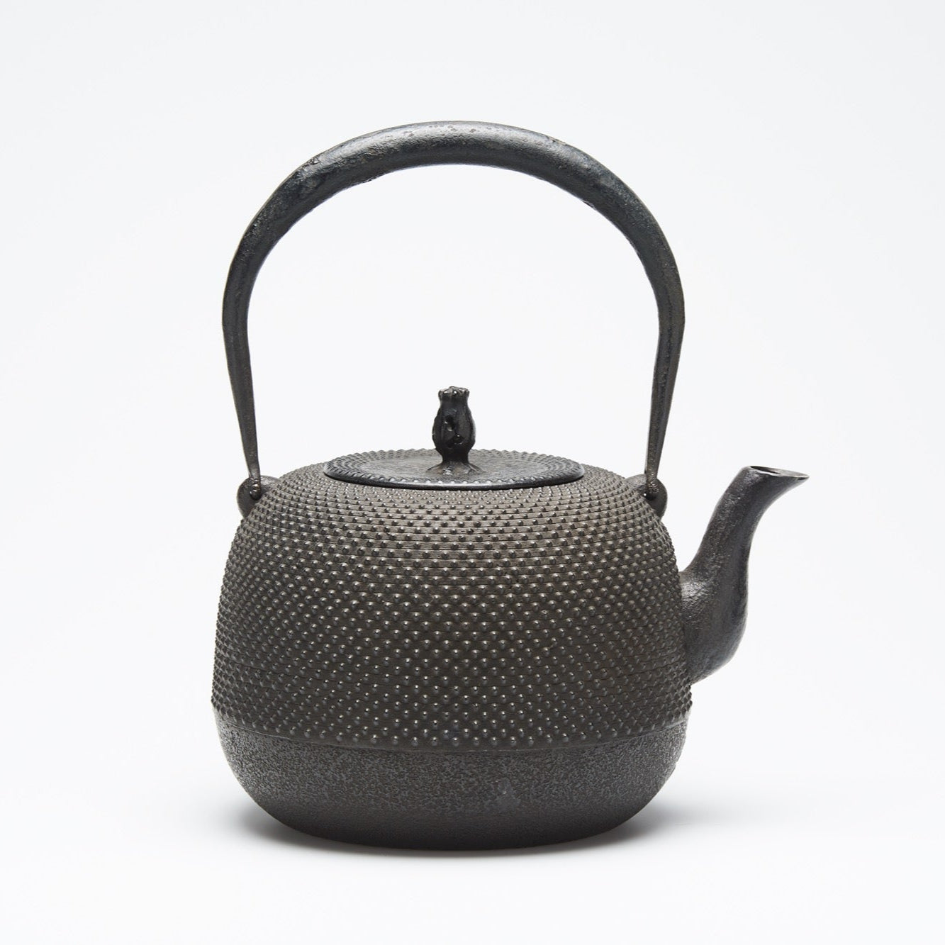 また、表面の独特な模様も南部鉄瓶の特徴の一つ。アラレ模様や動植物の模様など様々ありますが、見た目の美しさだけではなく、鉄瓶の表面積を増やす目的もあります。こちらの霰模様の鉄瓶はその形状や大きさ、配置において微細な違いがあり、各鉄瓶に独自の美しさがあります。長く使い込むことで、さらに味わいが深まるため、一生ものの道具として大切にされることが多いです。また霰模様は日本の伝統的な模様のひとつ。シンプルながらも洗練された美しさをお楽しみください。