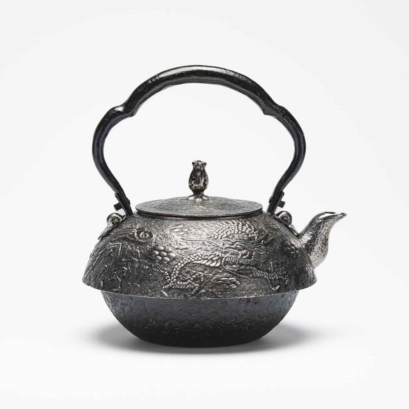 昭和から受け継がれる伝統!光沢のある砂鉄鉄瓶、雲竜模様が神秘的