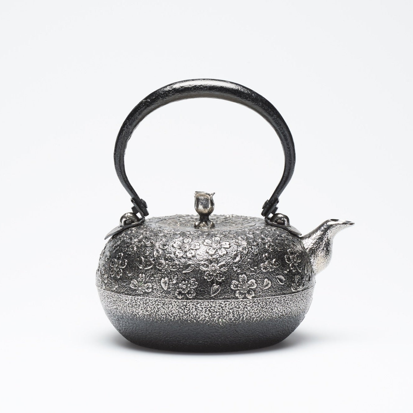 昭和から受け継がれる伝統!光沢を放つ砂鉄鉄瓶、桜模様が美しい