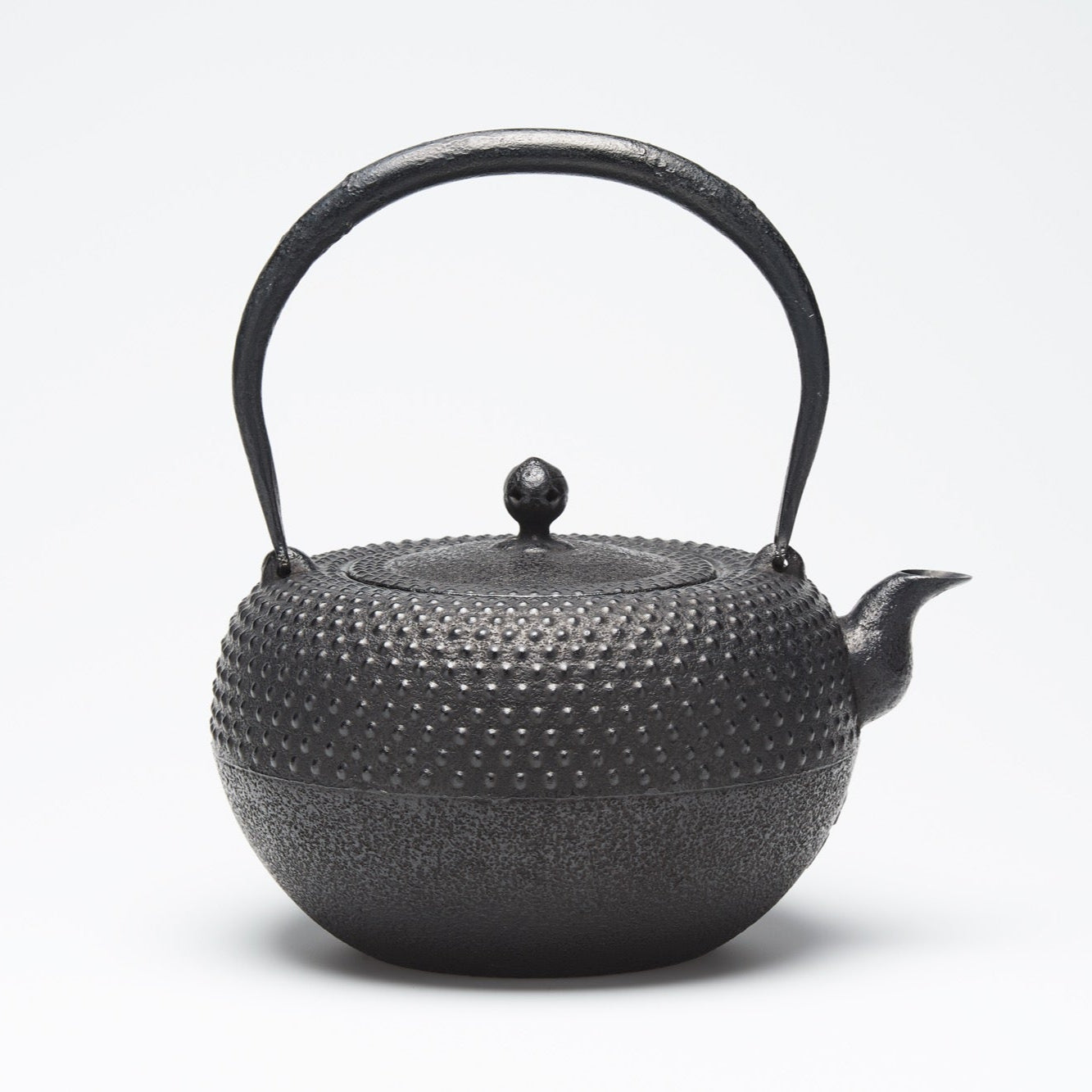 また、表面の独特な模様も南部鉄瓶の特徴の一つ。アラレ模様や動植物の模様など様々ありますが、見た目の美しさだけではなく、鉄瓶の表面積を増やす目的もあります。こちらの中霰模様の鉄瓶はその形状や大きさ、配置において微細な違いがあり、各鉄瓶に独自の美しさがあります。長く使い込むことで、さらに味わいが深まるため、一生ものの道具として大切にされることが多いです。また中霰模様は日本の伝統的な模様のひとつ。シンプルながらも洗練された美しさをお楽しみください。