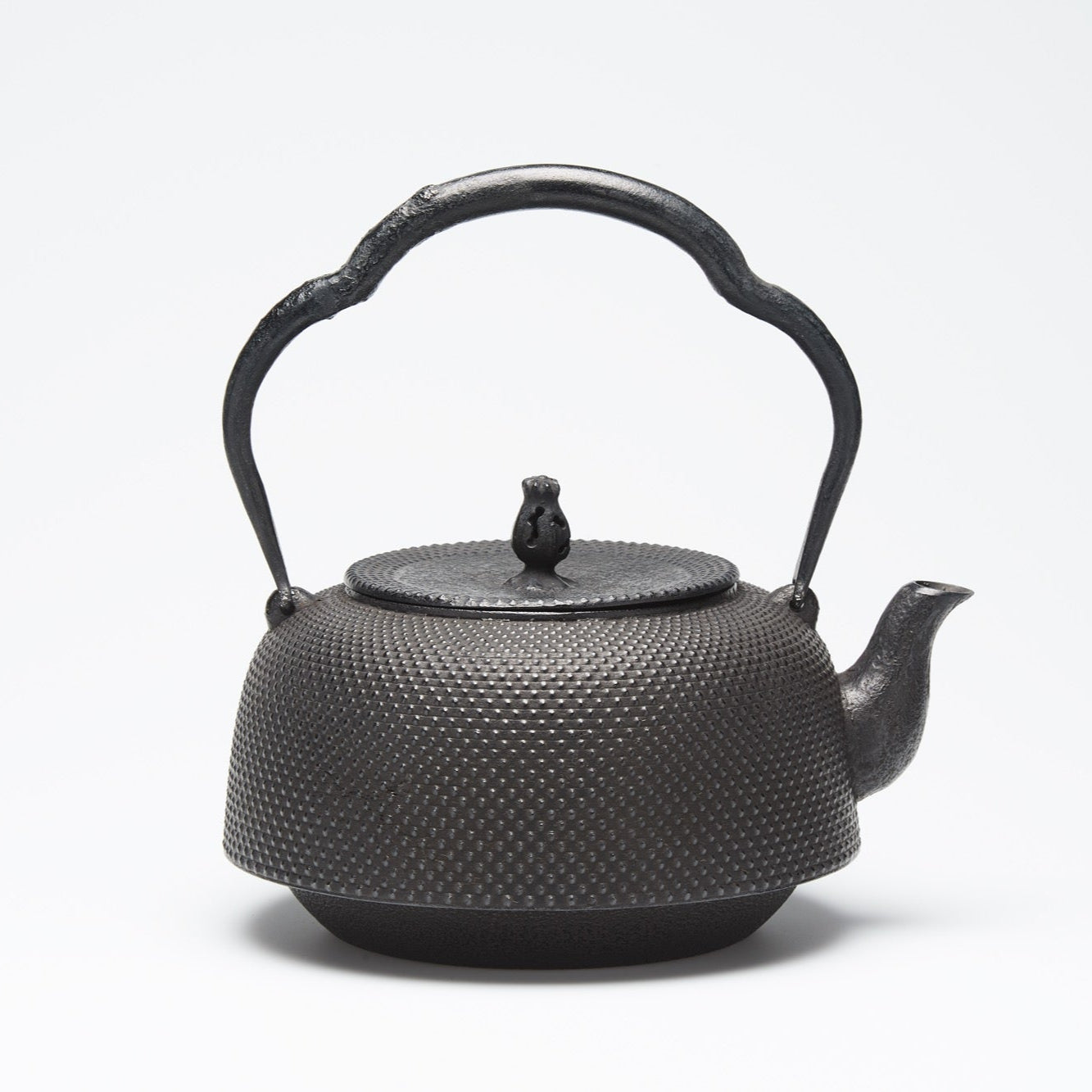また、表面の独特な模様も南部鉄瓶の特徴の一つ。アラレ模様や動植物の模様など様々ありますが、見た目の美しさだけではなく、鉄瓶の表面積を増やす目的もあります。こちらの霰模様の鉄瓶はその形状や大きさ、配置において微細な違いがあり、各鉄瓶に独自の美しさがあります。長く使い込むことで、さらに味わいが深まるため、一生ものの道具として大切にされることが多いです。また霰模様は日本の伝統的な模様のひとつ。シンプルながらも洗練された美しさをお楽しみください。
