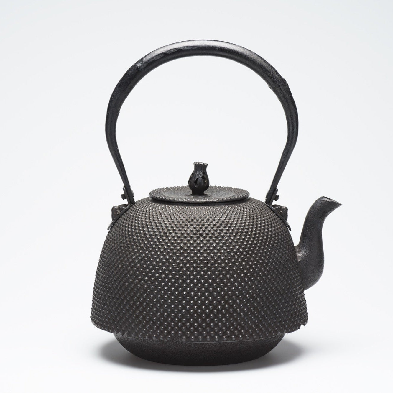 また、表面の独特な模様も南部鉄瓶の特徴の一つ。アラレ模様や動植物の模様など様々ありますが、見た目の美しさだけではなく、鉄瓶の表面積を増やす目的もあります。こちらの霰模様の鉄瓶はその形状や大きさ、配置において微細な違いがあり、各鉄瓶に独自の美しさがあります。長く使い込むことで、さらに味わいが深まるため、一生ものの道具として大切にされることが多いです。また霰模様は日本の伝統的な模様のひとつ。シンプルながらも洗練された美しさをお楽しみください。