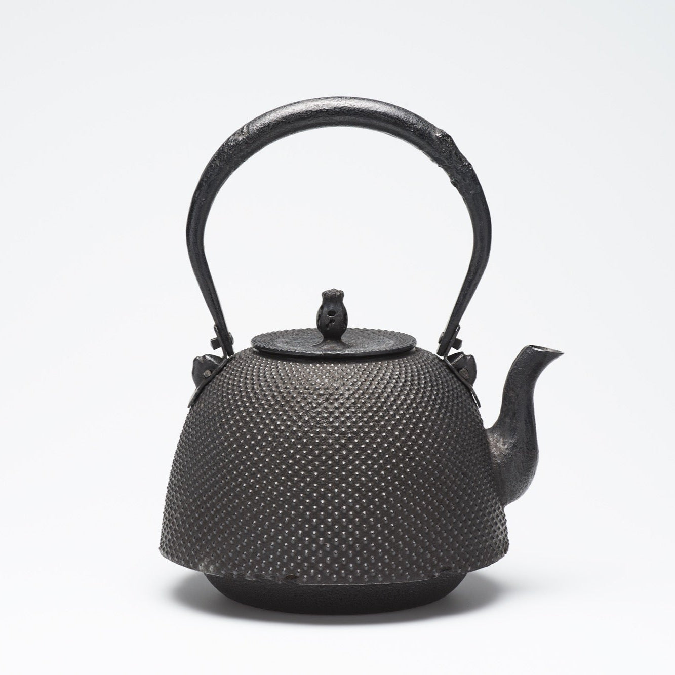 また、表面の独特な模様も南部鉄瓶の特徴の一つ。アラレ模様や動植物の模様など様々ありますが、見た目の美しさだけではなく、鉄瓶の表面積を増やす目的もあります。こちらの霰模様の鉄瓶はその形状や大きさ、配置において微細な違いがあり、各鉄瓶に独自の美しさがあります。長く使い込むことで、さらに味わいが深まるため、一生ものの道具として大切にされることが多いです。また霰模様は日本の伝統的な模様のひとつ。シンプルながらも洗練された美しさをお楽しみください。