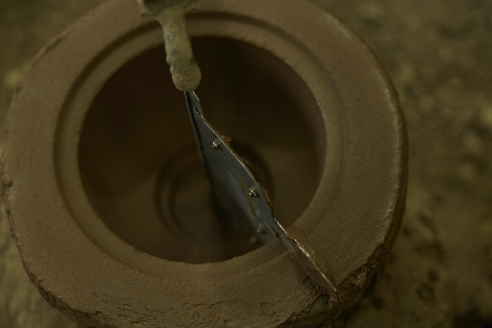 鉄瓶の厚みは、「鋳型」と「中子」の間の隙間で決まります。鋳型は鉄瓶の外形を形作る型で、中子は内部の空洞を作るための型です。中子は鋳型の内側に配置されます。
