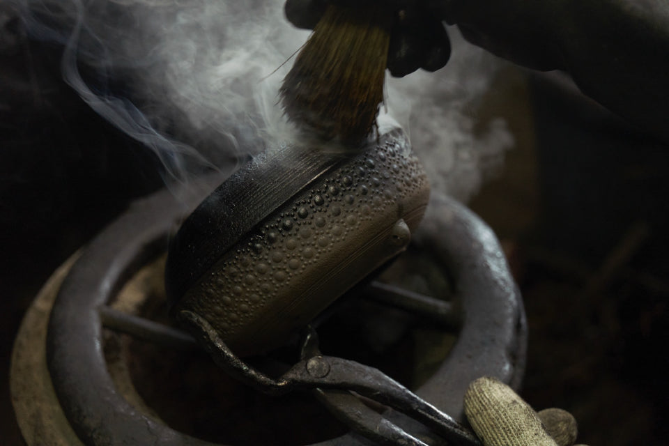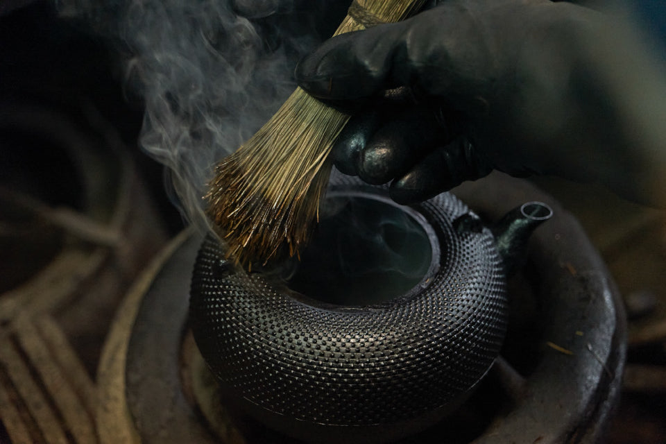 鉄瓶の仕上げは「本漆の手塗り」と「おはぐろ塗り」になります。本漆とは漆の木の樹液を100%使用したもので、鉄瓶本体との密着性に優れ、乾燥するとガラスのように硬くなり、傷跡などが付きにくくなります。鉄瓶を約250度に熱して本漆を塗り込み、さらにその上から茶汁と鉄錆を混合した液状のおはぐろを塗ります。