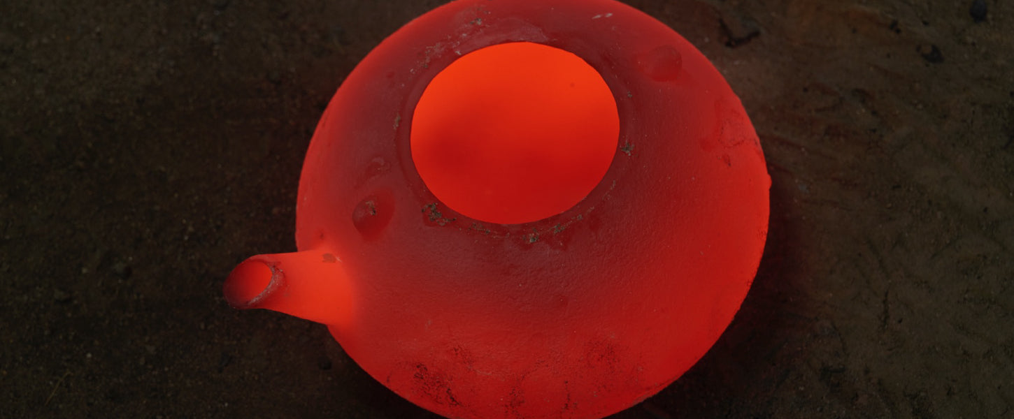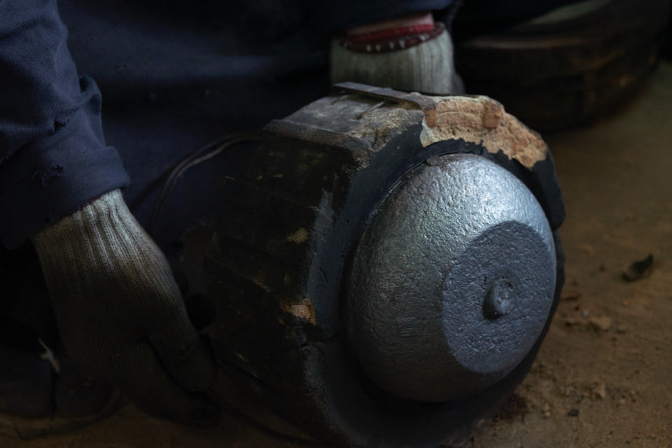 鉄瓶を取り出した後は、内部に残った中子を砕いて取り除き、外側の砂を丁寧に落とします。鋳バリ(余分な部分)は砥石やタガネで削り、金ブラシで表面を磨き上げます。最後に、鉄瓶本体で約800℃前後の炭火で30分~1 時間程焼き、表面に酸化被膜を形成。これにより、サビを防ぎます。